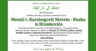 Dženaza-namaz će se klanjati u Srijedu (25.06.2025) poslije ikindija- namaza na mezarju u Hrankoviću gdje će se obaviti i ukop.